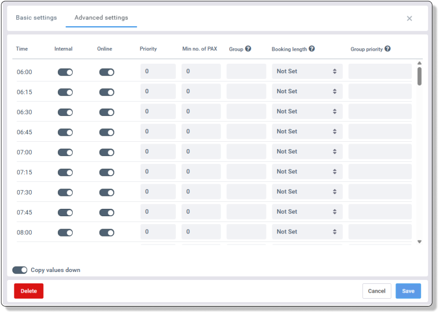 Here you can add settings per arrival time, set a minimum number of guests allowed on a table, and define a booking length for a special table.
